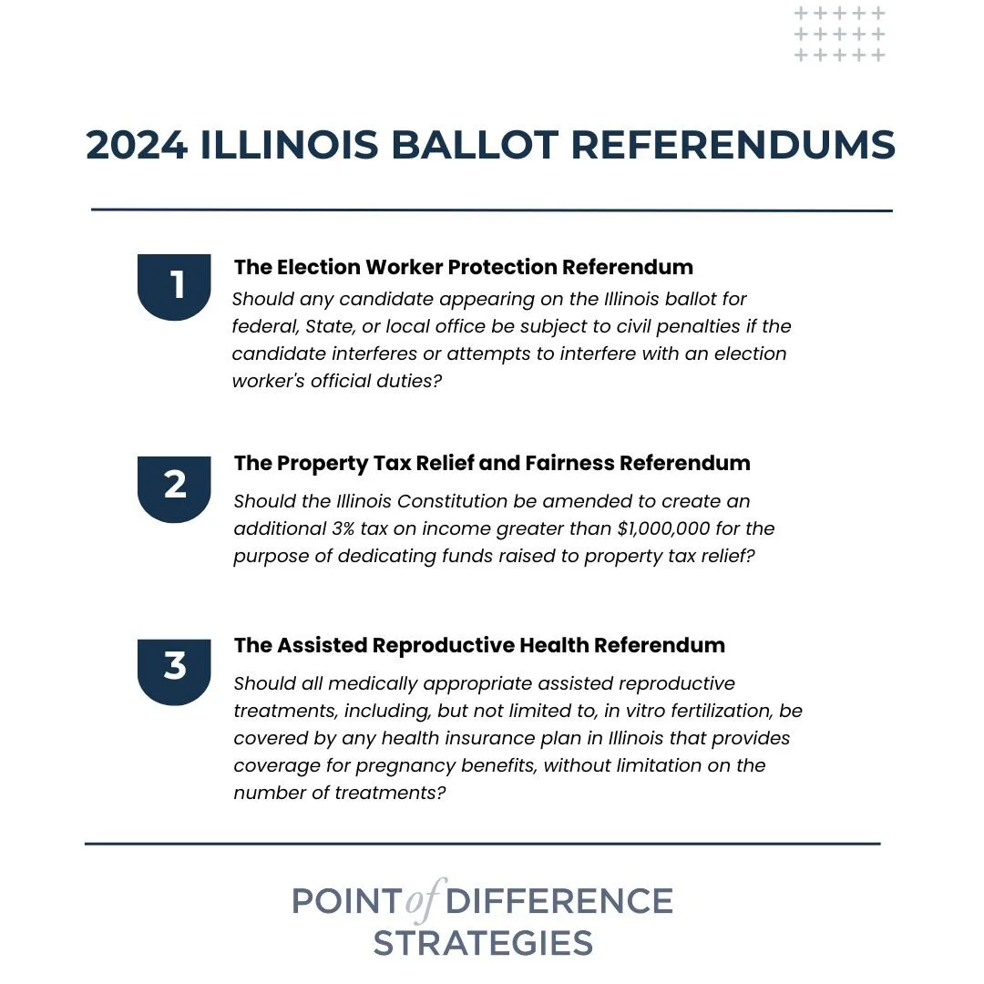 During this 2024 election cycle, Illinoisans have the opportunity to weigh in on three policy issues – insurance coverage for IVF treatments, property tax reform, and the creation of civil penalties for candidates who participate in election interference.